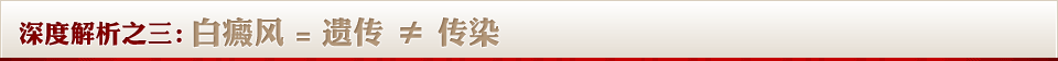 相關研究表明白癜風是有一定遺傳性的,在我國目前遺傳幾率在2-4%之間,遺傳幾率還是比較明顯的,因此也不能排除白癜風會隔代遺傳...[詳情]