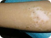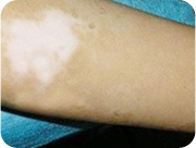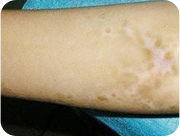 治療一個月后:白斑邊緣呈鋸齒狀向內(nèi)收縮,色素沉著延伸