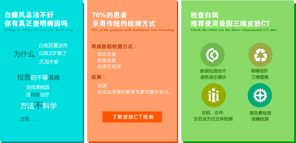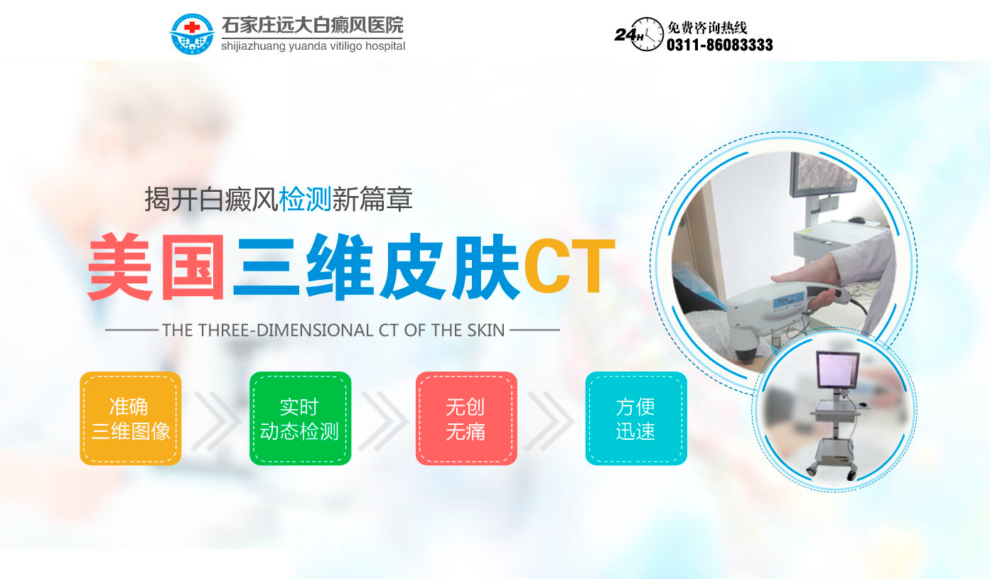 > 當白斑患者出現擴散情況的時候,患者千萬不要著急,要及時與專家溝通,進行專業準確的檢查,找到白癜風擴散的真正原因,美國三維皮膚CT能更準確的檢測出黑色素脫失情況......