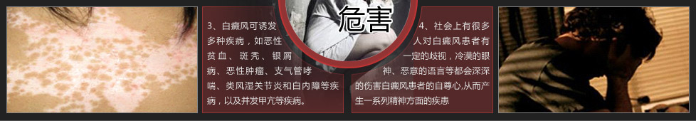 白癜風(fēng)的危害有哪些?白癜風(fēng)眾所周知,是一種非常可怕的皮膚疾病,白癜風(fēng)的發(fā)生對(duì)患者的外觀造成了極大的影響,對(duì)身體上的危害也是很嚴(yán)重的,很多患者對(duì)于疾病的危害不是很了解,不知道白癜風(fēng)的危害有哪些?