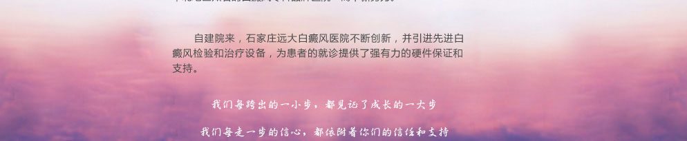 建院以來(lái),石家莊遠(yuǎn)大白癜風(fēng)院引進(jìn)數(shù)十套先進(jìn)設(shè)備,并不斷研究引進(jìn)特色科學(xué)療法,實(shí)現(xiàn)了從傳統(tǒng)到微創(chuàng)再到無(wú)創(chuàng)治療白癜風(fēng)。